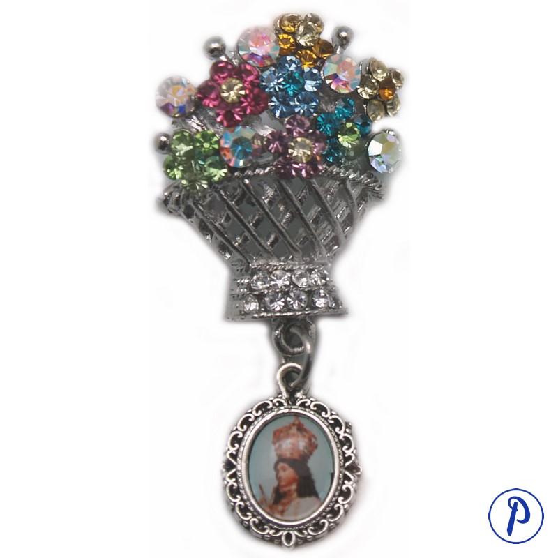 Broche bañado en plata en forma de cesta con flores adornadas con piedras brillantes. Medallita colgante ovalada con imagen personalizada. Tamaño aproximado 5 x 2,5 cm.