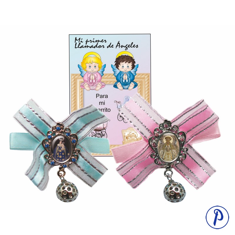 Broche de lazo para carrito con llamador de ángeles. Color azul o rosa con imagen personalizada.