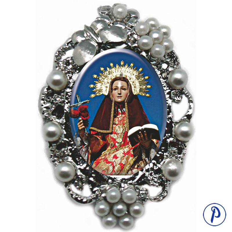 Broche en forma ovalada con orla adornada con perlas blancas. Imagen personalizada. Tamaño aproximado 4,5 x 3 cm.