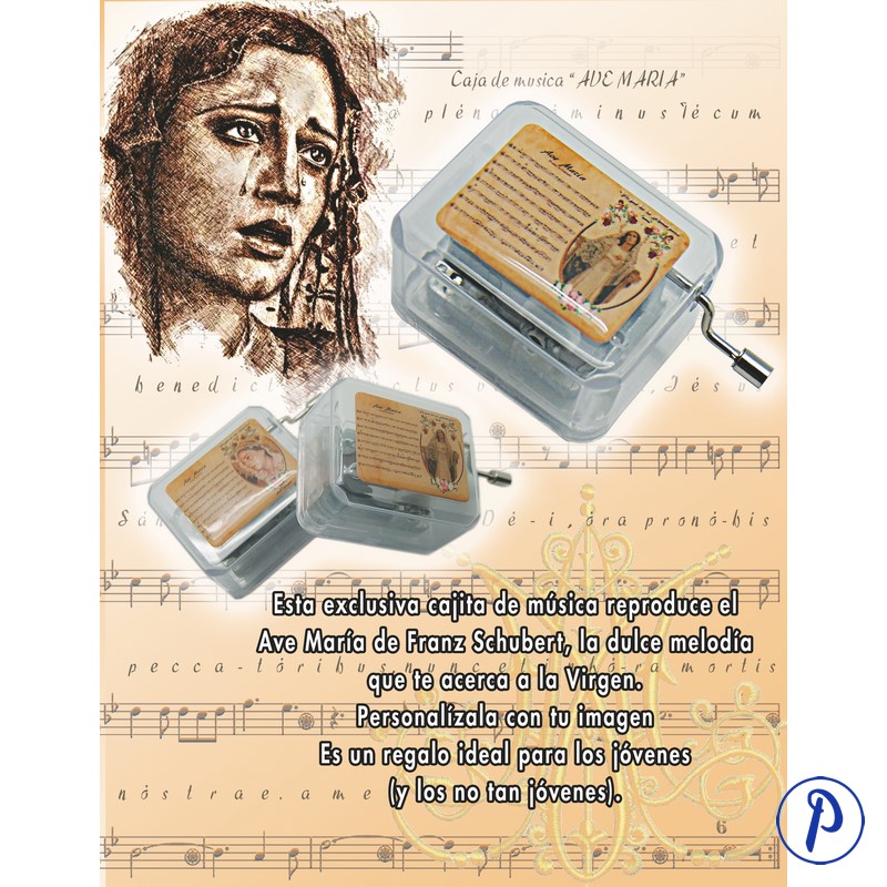 Exclusiva caja de música del «Ave María de Franz Schubert». Cajita personalizada con imagen del cliente. Tamaño aproximado 6 x 5 cm.