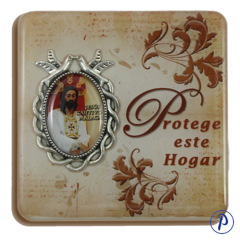 Imán cuadrado en fotoesmalte con texto «Protege este hogar» con medalla personalizada. Tamaño aproximado 6,5 x 6,5 cm.