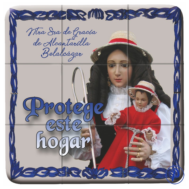 Imán cuadrado simulando mosaico azulejo en fotoesmalte personalizado con texto «Protege este hogar». Tamaño aproximado 6,5 x 6,5 cm.