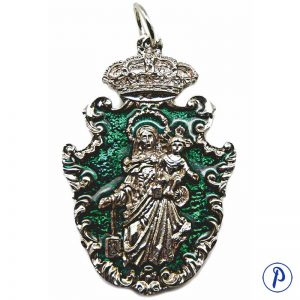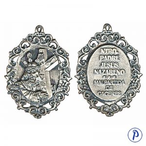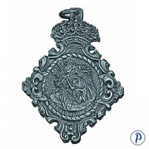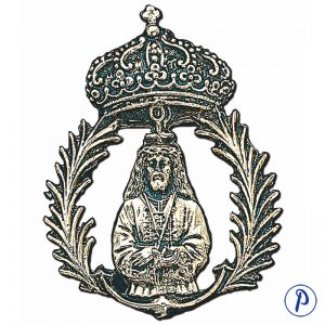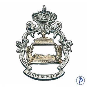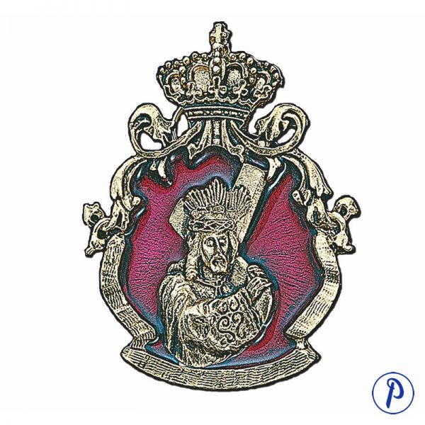 Medalla de cofradía en baño de oro con banda y corona real calada. Interior de la medalla compuesto por fondo esmaltado con silueta en baño de oro. Tamaño aproximado 7,5 x 4 cm.