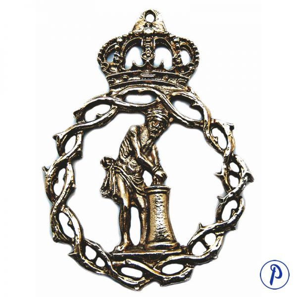 Medalla de cofradía en baño de oro con forma redonda con corona de espinas de 2 hilos. Corona real y silueta de Cristo en su interior. Tamaño aproximado 6,5 x 5 cm.