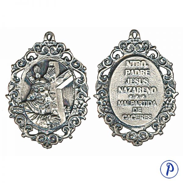 Medalla de cofradía en baño de plata con forma ovalada con orla labrada e imagen con relieve. Tamaño aproximado 7,5 x 5,5 cm.