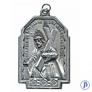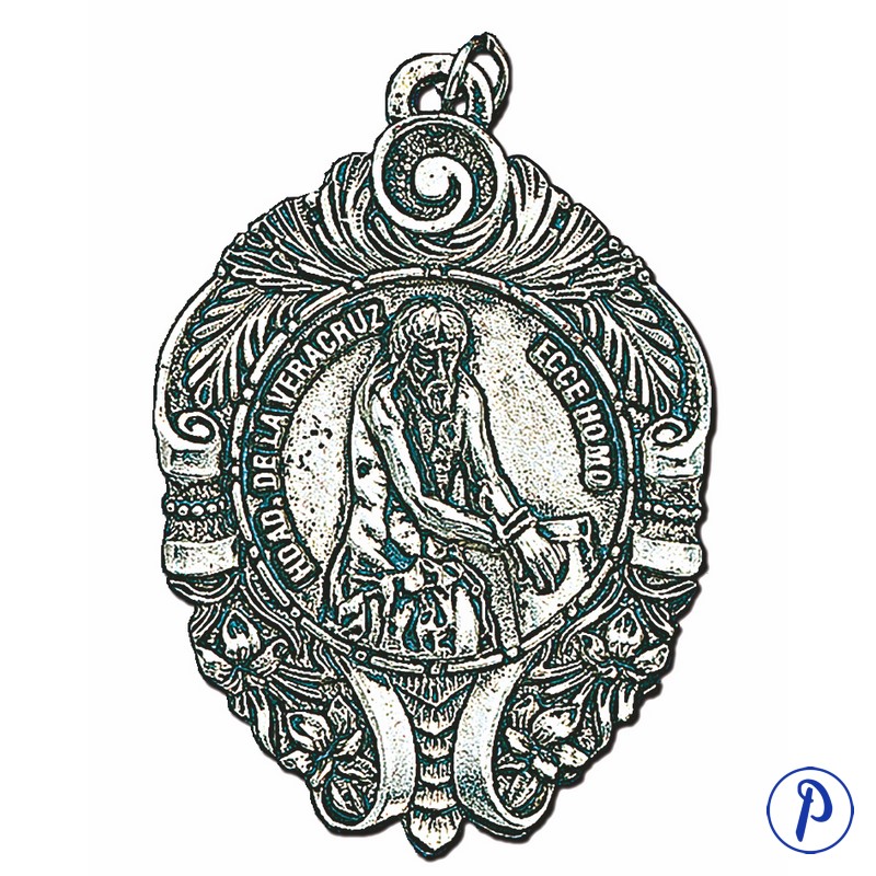 Medalla de cofradía en niquel en forma ovalada con aureola e imagen en relieve central. Tamaño aproximado 7,5 x 5,5 cm.