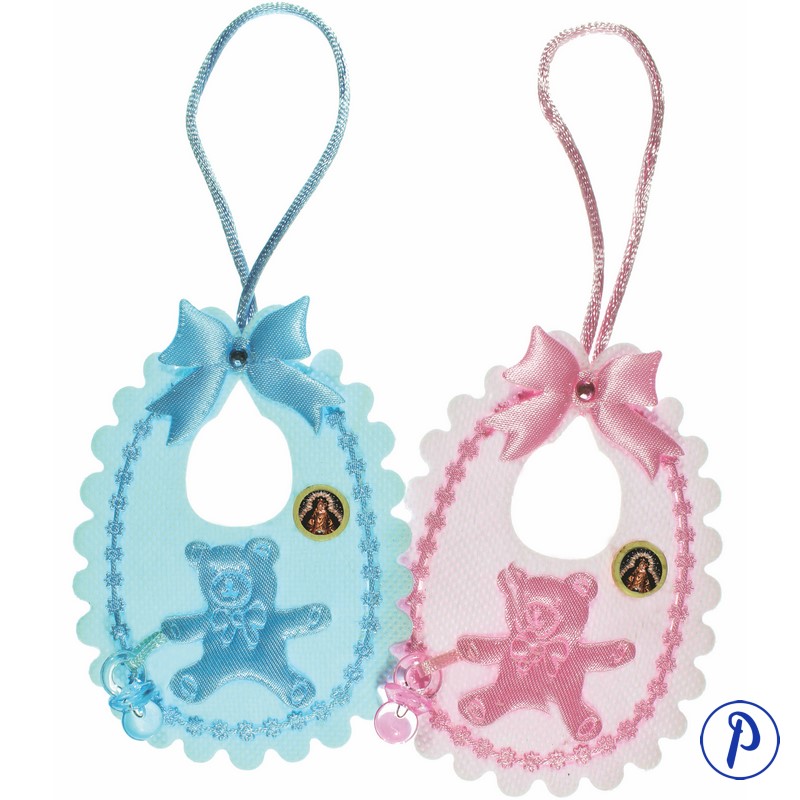 Medalla de cuna de tela con osito y chupete en rosa o azul. Imagen personalizable.