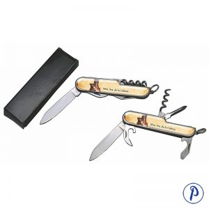 Navaja de acero con puño personalizado, montaje e imagen grabada en el acero. Tamaño aproximado 7,5 x 2,5 cm.