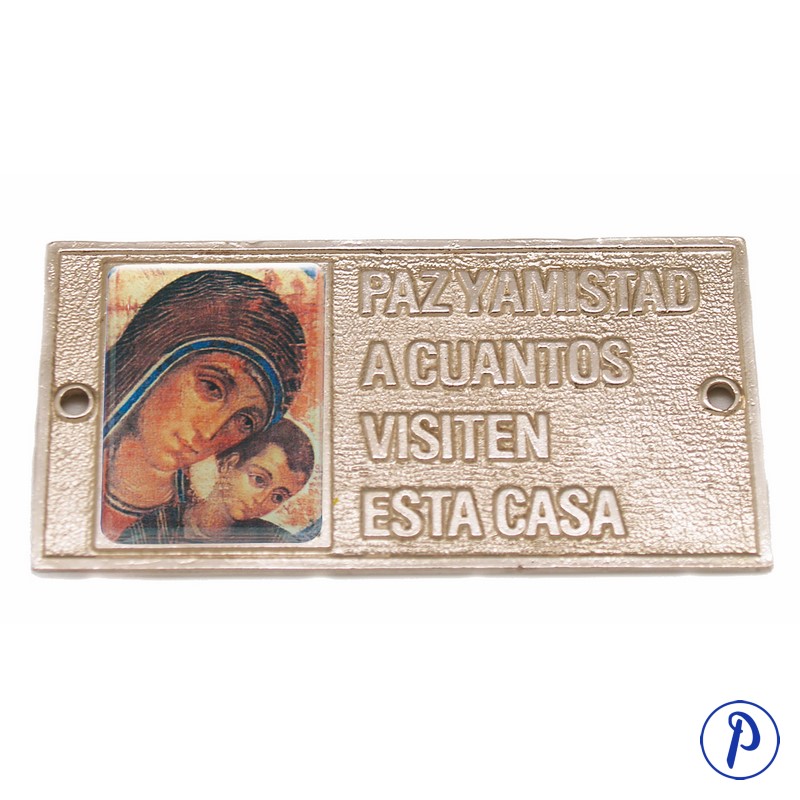 Placa para la puerta del hogar en niquel con forma rectangular horizontal con imagen personalizada y texto «Paz y amistad a cuantos visiten esta casa». Tamaño aproximado 5 x 9 cm.
