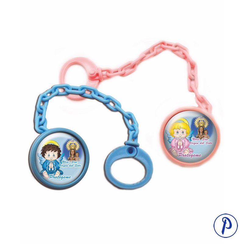 Portachupete en color rosa o azul con enganche redondo con imagen de angelito «Protégeme» e imagen personalizada.