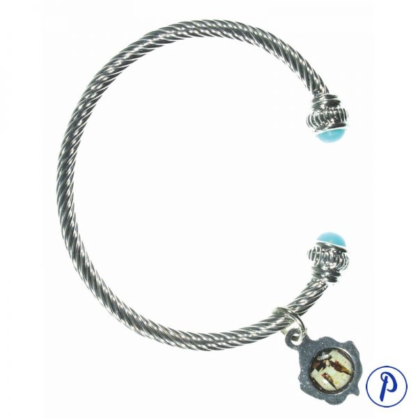 Pulsera laminada con en baño de plata con acabados en piedra turquesa con imagen personalizada en medallita.