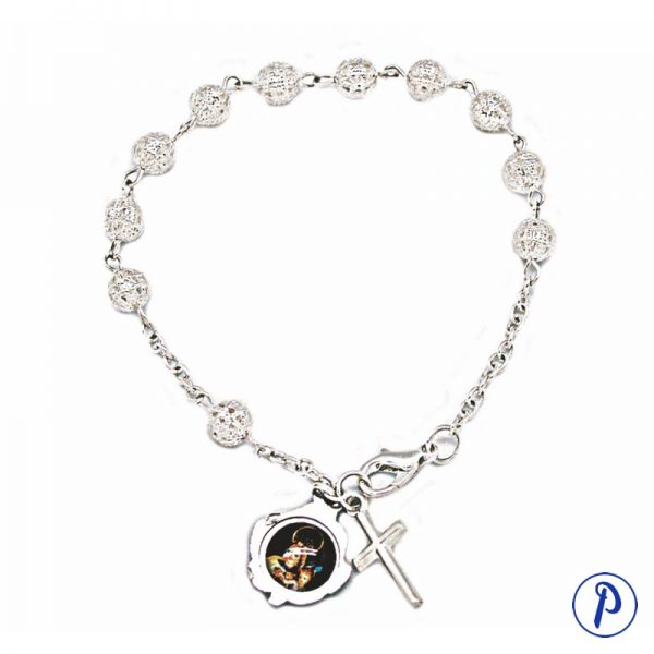 Pulsera en baño de plata con bolitas caladas, cruz e imagen personalizada en medallita.