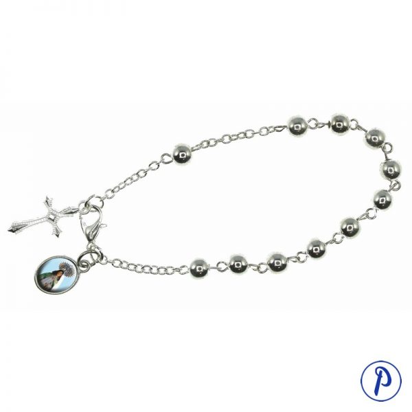 Pulsera adornada con bolitas en baño de plata, cruz e imagen personalizada en medallita ovalada.