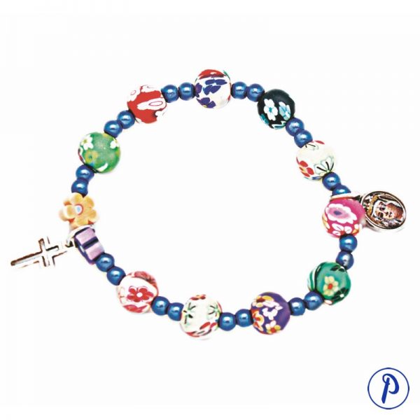 Pulsera para niña con adornos de bolitas de colores en caucho con imagen personalizada y cruz plateada.
