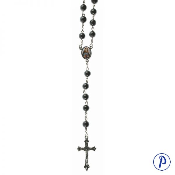 Rosario con cuentas de mineral hematite con imagen personalizada en medallita ovalada.