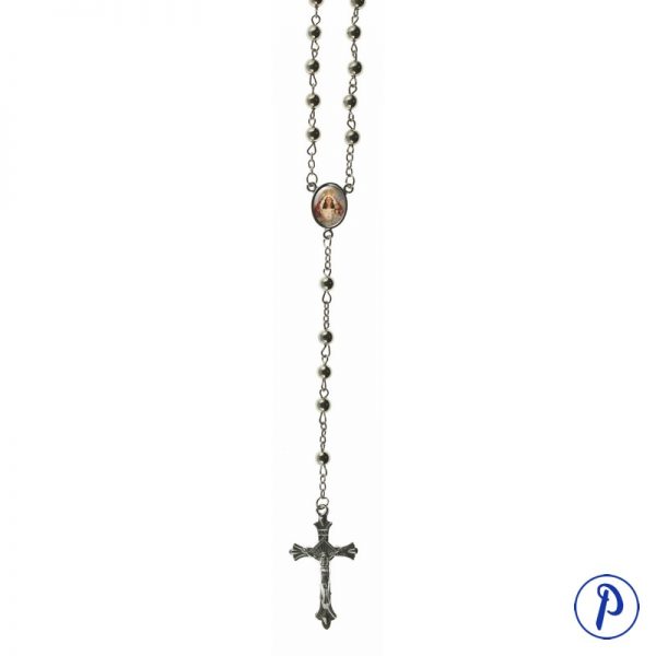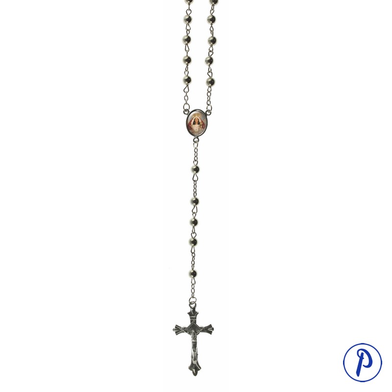 Rosario con cuentas lisas en baño de plata con imagen personalizada en medallita ovalada.