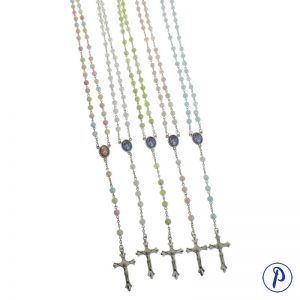 Surtido de rosarios en baño de plata con cuentas de cristal en diferentes colores (negro, verde, morado, azul, rojo y blanco) con imagen personalizada en camafeo en forma de corazón.